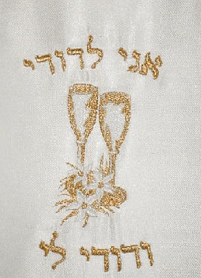 This is a sample of an embroidery that I did on a wedding bag I made. The bag is satin and fully lined with a poly/satin lining, and a corded drawstring closure. This one is gold metallic with white "mother-of-pearl" colored thread for the flowers and glass center. It reads Ani LDodi.... I am my beloved's and my beloved is mine. It measures approximately 7" x 10". Price for this: $55.00 These are done by special order only. Your choice of design, saying, and personalization. Prices will vary Please contact me for more information. |