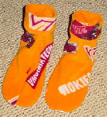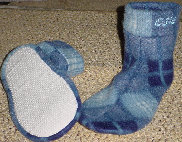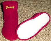 These are samples of my fleece slipper socks. Because of the large variety of sizes, I cannot display every fleece design that I have. These are made with slipper foam (optional) and jiffy grip on the soles.As you can see, I can also embroider your team logo, name, etc. Foam is not put into to infant and toddler sizes. Machine wash and dry. Sizes available: Infant through men's 13. Prices: Infant, toddler, children: $10-$15 Adult: $15-20 Embroidery extra. |