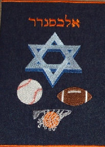 These are more samples of custom ordered Siddur Covers made to fit Siddur Sim Shalom. Covers can be made to fit any hardcover book. Prices vary depending on size, fabric, embroidery design, and if metallic threads are used. Please contact for further info.