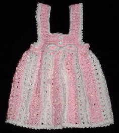 This beautifully styled, lacey-look summer dress, was hand-crocheted with pink and white 100% acrylic baby yarn. The front has 2 attached buttons (for show) and a crocheted cording woven through the bottom yoke stitches to adjust for comfort, and tied in a bow, and a gathered bodice. The back yoke closure has 4 invisible (clear) snaps. The picot border does not continue under the arm to avoid any irritation. Will fit chest size up to 19". Length from top of shoulder approx 18". Size: 18mos+ Price: $55.00 |
