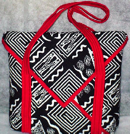 This is a very unique bag. After quilting and binding the fabric, it is folded and sewn together in a way that leaves you with a very roomy inside, large V-shaped pockets outside (front and back), that are covered with the flaps. Straps are also quilted. It measures approximately 15" x 15" x 31/2". Price: $60.00. |